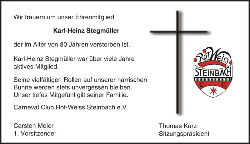 Hier finden Sie alle Traueranzeigen aus der Zeitung, die bisher für Karl-Heinz Stegmüller erschienen sind. Weitere Traueranzeigen, die in der Zeitung erscheinen, werden hier ebenfalls aufgelistet