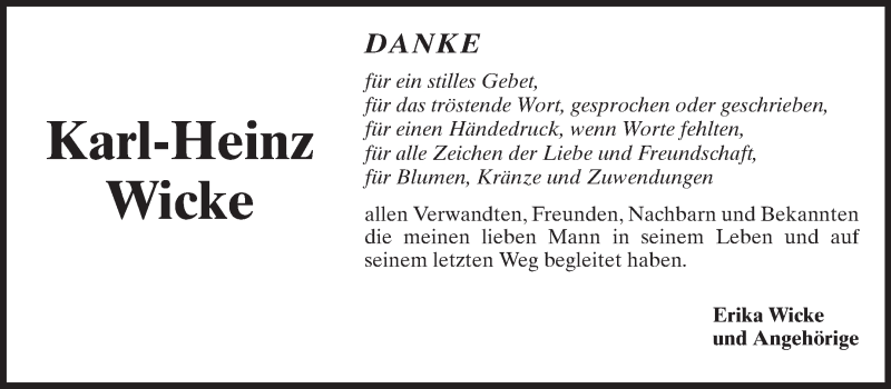 Hier finden Sie alle Traueranzeigen aus der Zeitung, die bisher für Karl-Heinz Wicke erschienen sind. Weitere Traueranzeigen, die in der Zeitung erscheinen, werden hier ebenfalls aufgelistet