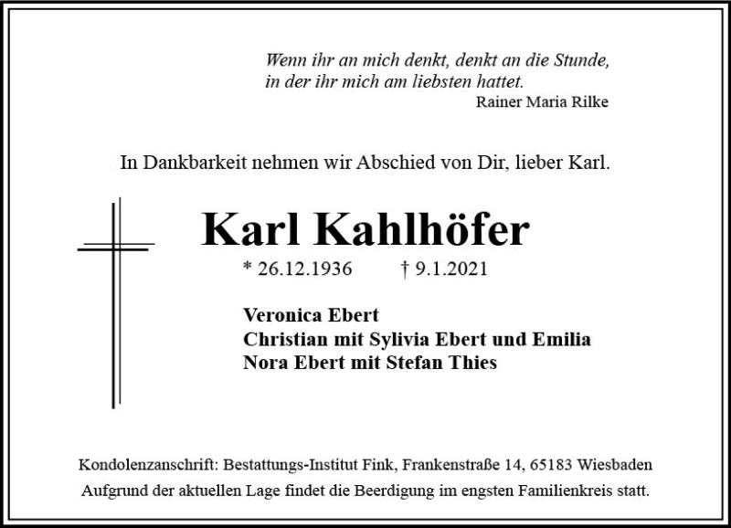 Hier finden Sie alle Traueranzeigen aus der Zeitung, die bisher für Karl Kahlhöfer erschienen sind. Weitere Traueranzeigen, die in der Zeitung erscheinen, werden hier ebenfalls aufgelistet