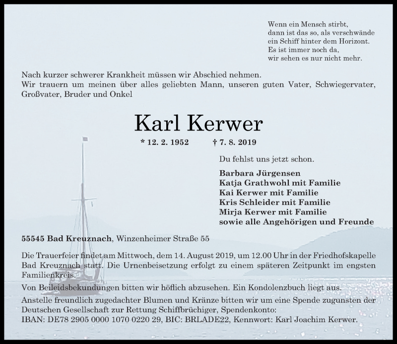 Hier finden Sie alle Traueranzeigen aus der Zeitung, die bisher für Karl Kerwer erschienen sind. Weitere Traueranzeigen, die in der Zeitung erscheinen, werden hier ebenfalls aufgelistet