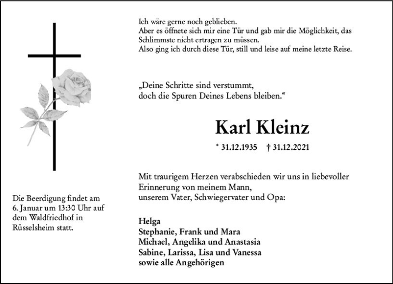 Hier finden Sie alle Traueranzeigen aus der Zeitung, die bisher für Karl Kleinz erschienen sind. Weitere Traueranzeigen, die in der Zeitung erscheinen, werden hier ebenfalls aufgelistet