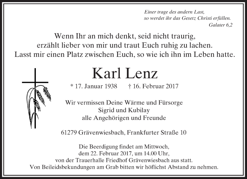 Hier finden Sie alle Traueranzeigen aus der Zeitung, die bisher für Karl Lenz erschienen sind. Weitere Traueranzeigen, die in der Zeitung erscheinen, werden hier ebenfalls aufgelistet