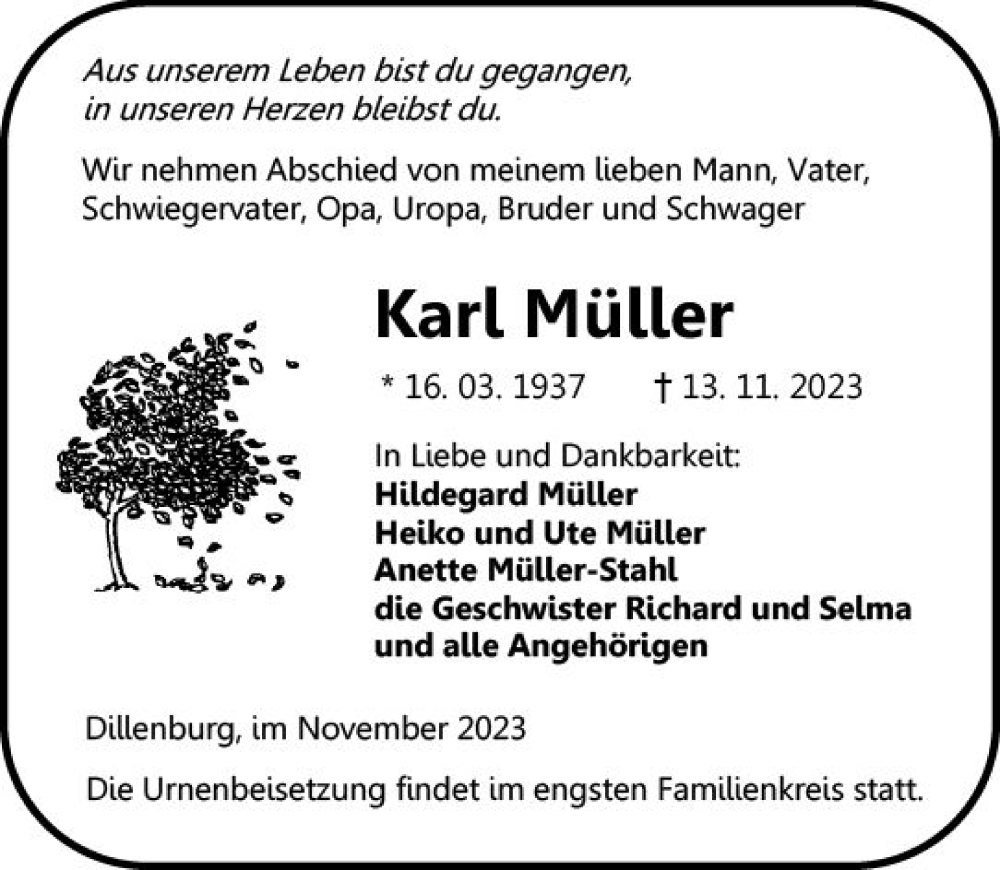 Hier finden Sie alle Traueranzeigen aus der Zeitung, die bisher für Karl Müller erschienen sind. Weitere Traueranzeigen, die in der Zeitung erscheinen, werden hier ebenfalls aufgelistet