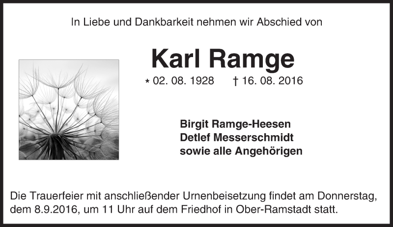 Hier finden Sie alle Traueranzeigen aus der Zeitung, die bisher für Karl Ramge erschienen sind. Weitere Traueranzeigen, die in der Zeitung erscheinen, werden hier ebenfalls aufgelistet