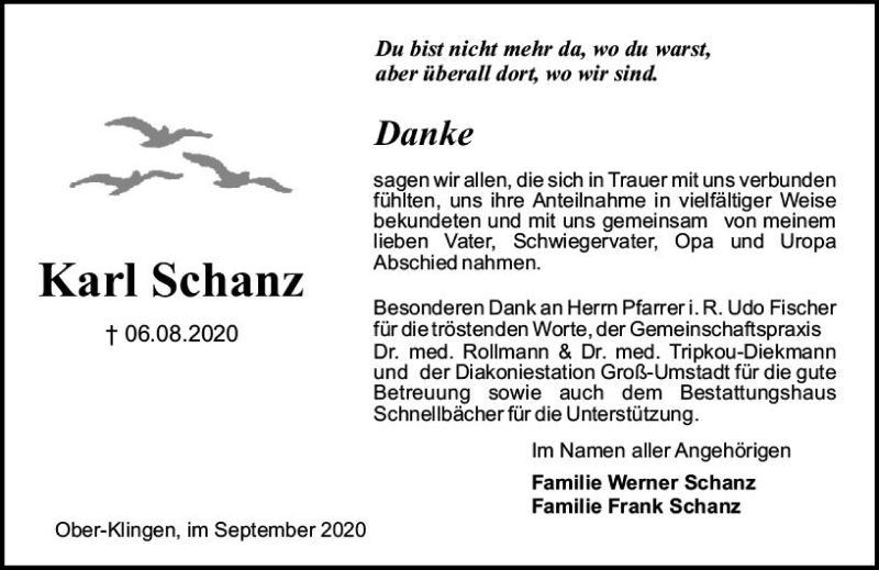 Hier finden Sie alle Traueranzeigen aus der Zeitung, die bisher für Karl Schanz erschienen sind. Weitere Traueranzeigen, die in der Zeitung erscheinen, werden hier ebenfalls aufgelistet