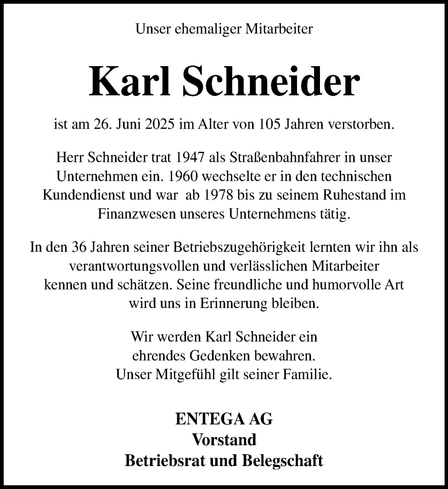 Hier finden Sie alle Traueranzeigen aus der Zeitung, die bisher für Karl Schneider erschienen sind. Weitere Traueranzeigen, die in der Zeitung erscheinen, werden hier ebenfalls aufgelistet