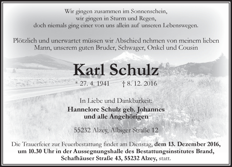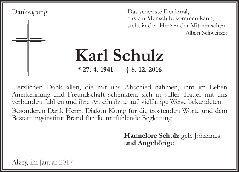 Hier finden Sie alle Traueranzeigen aus der Zeitung, die bisher für Karl Schulz erschienen sind. Weitere Traueranzeigen, die in der Zeitung erscheinen, werden hier ebenfalls aufgelistet