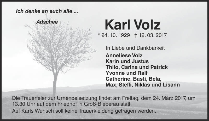 Hier finden Sie alle Traueranzeigen aus der Zeitung, die bisher für Karl Volz erschienen sind. Weitere Traueranzeigen, die in der Zeitung erscheinen, werden hier ebenfalls aufgelistet