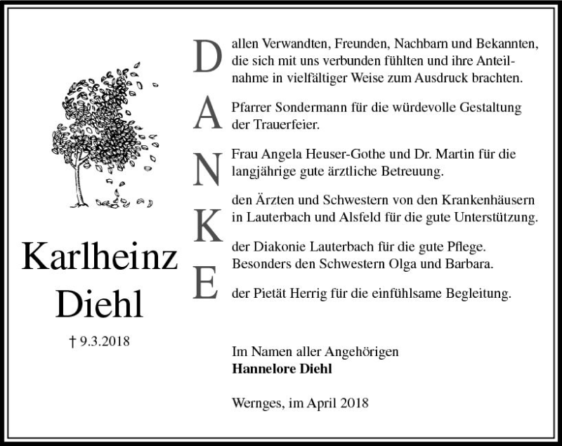 Hier finden Sie alle Traueranzeigen aus der Zeitung, die bisher für Karlheinz Diehl erschienen sind. Weitere Traueranzeigen, die in der Zeitung erscheinen, werden hier ebenfalls aufgelistet