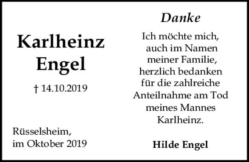 Hier finden Sie alle Traueranzeigen aus der Zeitung, die bisher für Karlheinz Engel erschienen sind. Weitere Traueranzeigen, die in der Zeitung erscheinen, werden hier ebenfalls aufgelistet