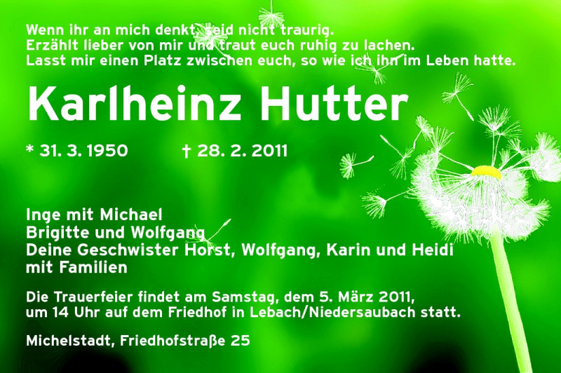 Hier finden Sie alle Traueranzeigen aus der Zeitung, die bisher für Karlheinz Hutter erschienen sind. Weitere Traueranzeigen, die in der Zeitung erscheinen, werden hier ebenfalls aufgelistet