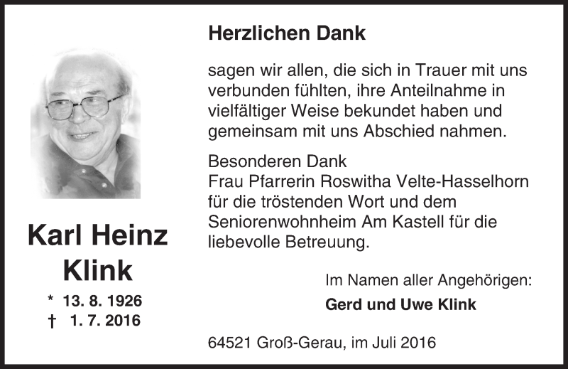Hier finden Sie alle Traueranzeigen aus der Zeitung, die bisher für Karl Heinz Klink erschienen sind. Weitere Traueranzeigen, die in der Zeitung erscheinen, werden hier ebenfalls aufgelistet
