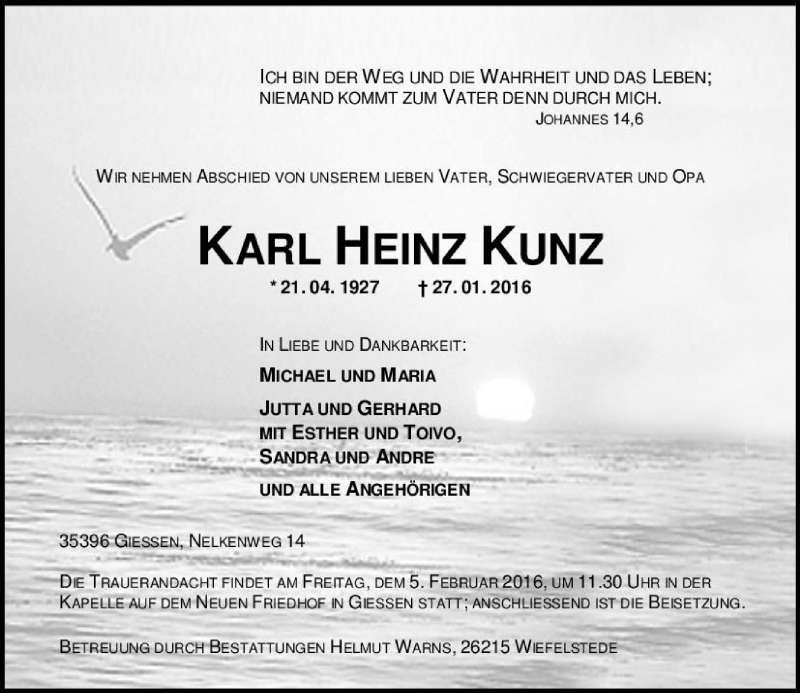 Hier finden Sie alle Traueranzeigen aus der Zeitung, die bisher für Karl Heinz Kunz erschienen sind. Weitere Traueranzeigen, die in der Zeitung erscheinen, werden hier ebenfalls aufgelistet