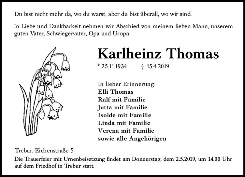 Hier finden Sie alle Traueranzeigen aus der Zeitung, die bisher für Karlheinz Thomas erschienen sind. Weitere Traueranzeigen, die in der Zeitung erscheinen, werden hier ebenfalls aufgelistet