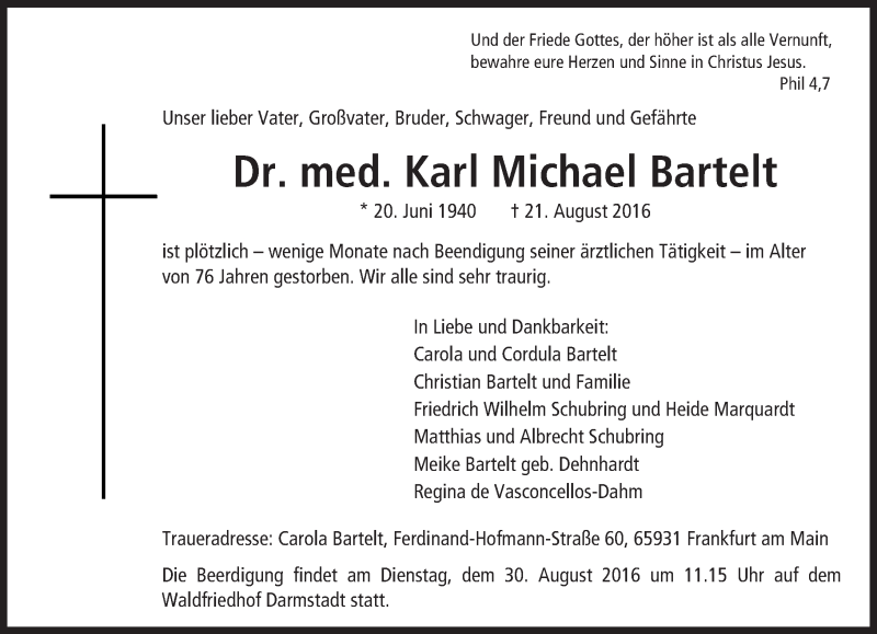 Hier finden Sie alle Traueranzeigen aus der Zeitung, die bisher für Karl Michael Bartelt erschienen sind. Weitere Traueranzeigen, die in der Zeitung erscheinen, werden hier ebenfalls aufgelistet