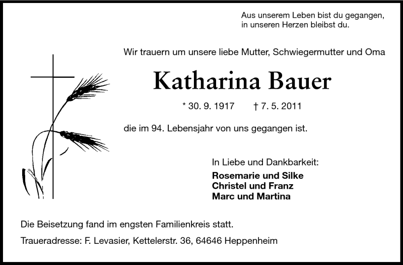 Hier finden Sie alle Traueranzeigen aus der Zeitung, die bisher für Katharina Bauer erschienen sind. Weitere Traueranzeigen, die in der Zeitung erscheinen, werden hier ebenfalls aufgelistet