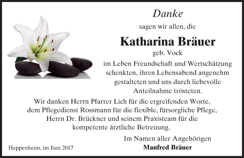 Hier finden Sie alle Traueranzeigen aus der Zeitung, die bisher für Katharina Bräuer erschienen sind. Weitere Traueranzeigen, die in der Zeitung erscheinen, werden hier ebenfalls aufgelistet