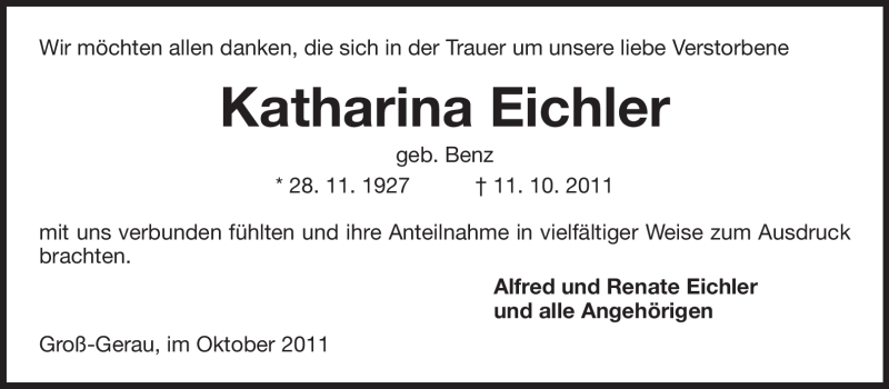 Hier finden Sie alle Traueranzeigen aus der Zeitung, die bisher für Katharina Eichler erschienen sind. Weitere Traueranzeigen, die in der Zeitung erscheinen, werden hier ebenfalls aufgelistet