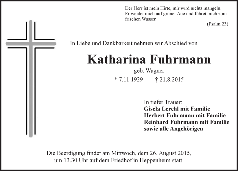 Hier finden Sie alle Traueranzeigen aus der Zeitung, die bisher für Katharina Fuhrmann erschienen sind. Weitere Traueranzeigen, die in der Zeitung erscheinen, werden hier ebenfalls aufgelistet