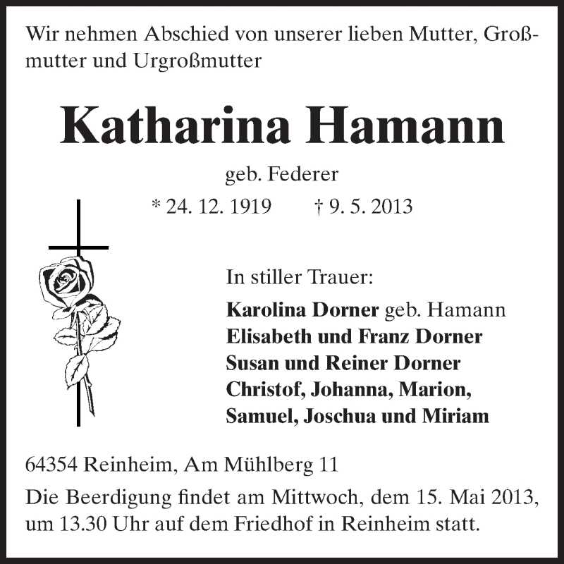 Hier finden Sie alle Traueranzeigen aus der Zeitung, die bisher für Katharina Hamann erschienen sind. Weitere Traueranzeigen, die in der Zeitung erscheinen, werden hier ebenfalls aufgelistet