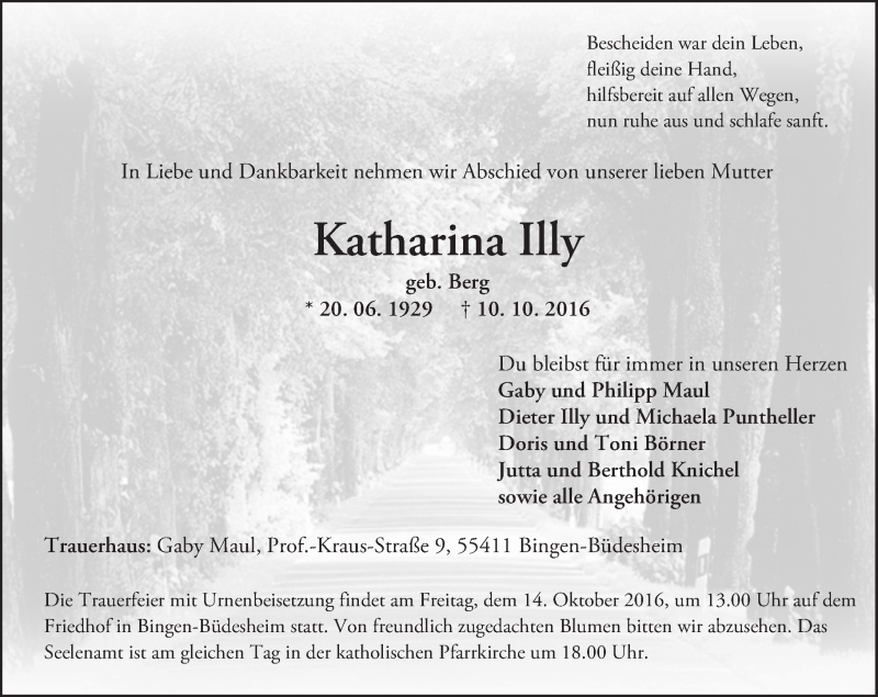 Hier finden Sie alle Traueranzeigen aus der Zeitung, die bisher für Katharina Illy erschienen sind. Weitere Traueranzeigen, die in der Zeitung erscheinen, werden hier ebenfalls aufgelistet