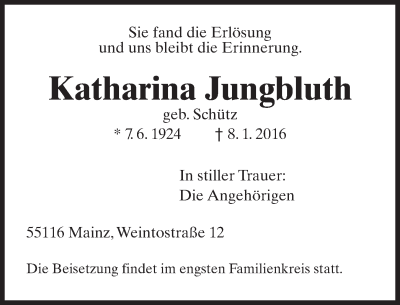 Hier finden Sie alle Traueranzeigen aus der Zeitung, die bisher für Katharina Jungbluth erschienen sind. Weitere Traueranzeigen, die in der Zeitung erscheinen, werden hier ebenfalls aufgelistet