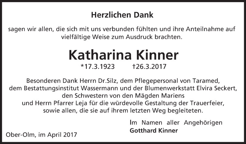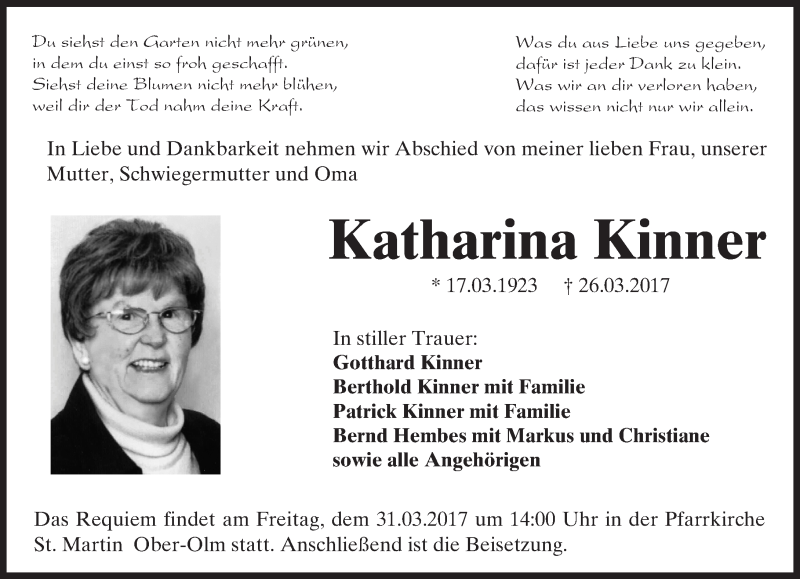 Hier finden Sie alle Traueranzeigen aus der Zeitung, die bisher für Katharina Kinner erschienen sind. Weitere Traueranzeigen, die in der Zeitung erscheinen, werden hier ebenfalls aufgelistet