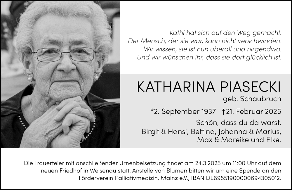 Hier finden Sie alle Traueranzeigen aus der Zeitung, die bisher für Katharina Piasecki erschienen sind. Weitere Traueranzeigen, die in der Zeitung erscheinen, werden hier ebenfalls aufgelistet