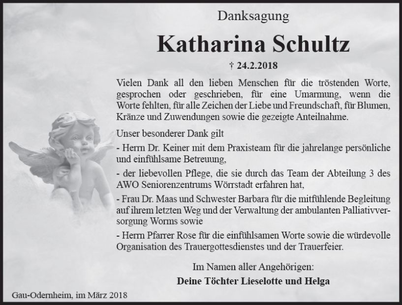 Hier finden Sie alle Traueranzeigen aus der Zeitung, die bisher für Katharina Schultz erschienen sind. Weitere Traueranzeigen, die in der Zeitung erscheinen, werden hier ebenfalls aufgelistet