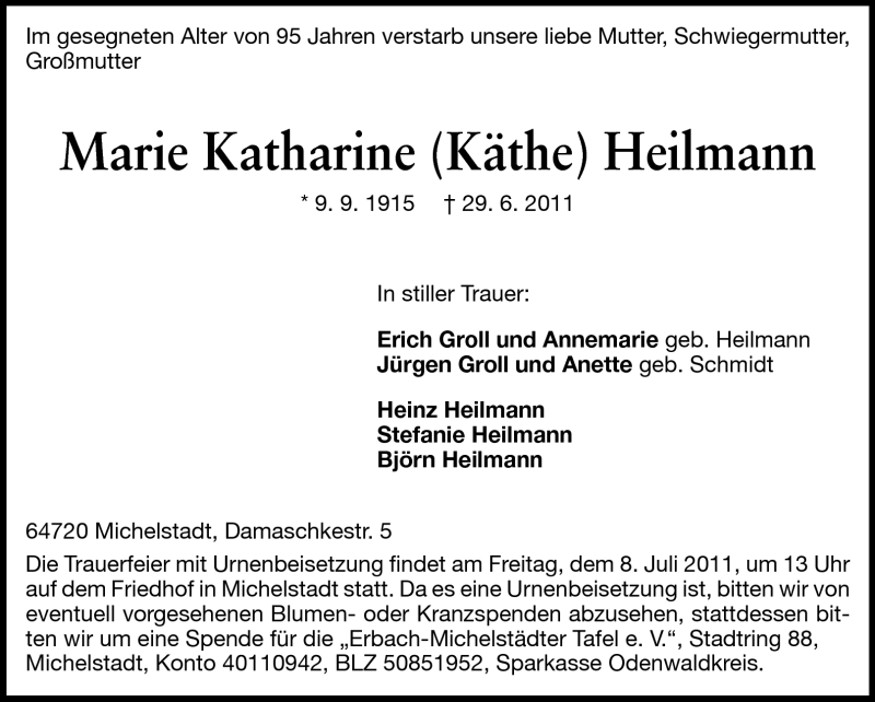 Hier finden Sie alle Traueranzeigen aus der Zeitung, die bisher für Katharine Heilmann erschienen sind. Weitere Traueranzeigen, die in der Zeitung erscheinen, werden hier ebenfalls aufgelistet
