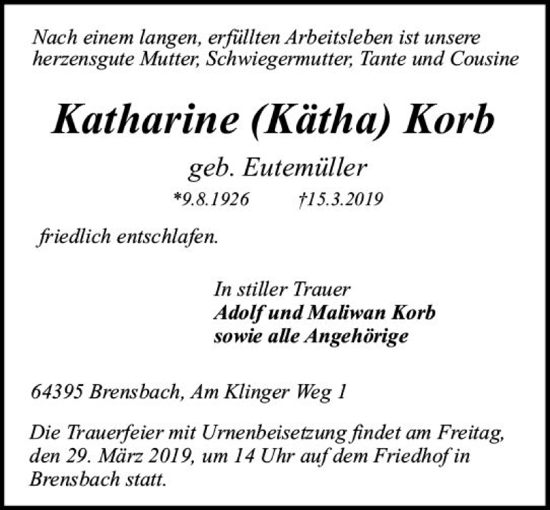 Hier finden Sie alle Traueranzeigen aus der Zeitung, die bisher für Katharine Korb erschienen sind. Weitere Traueranzeigen, die in der Zeitung erscheinen, werden hier ebenfalls aufgelistet