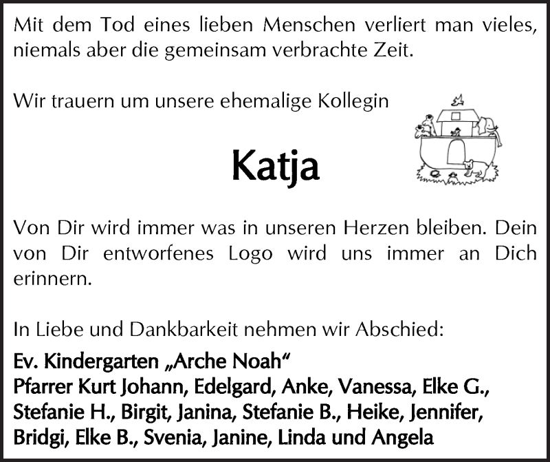 Hier finden Sie alle Traueranzeigen aus der Zeitung, die bisher für Katja Lerch erschienen sind. Weitere Traueranzeigen, die in der Zeitung erscheinen, werden hier ebenfalls aufgelistet