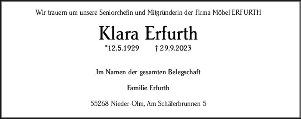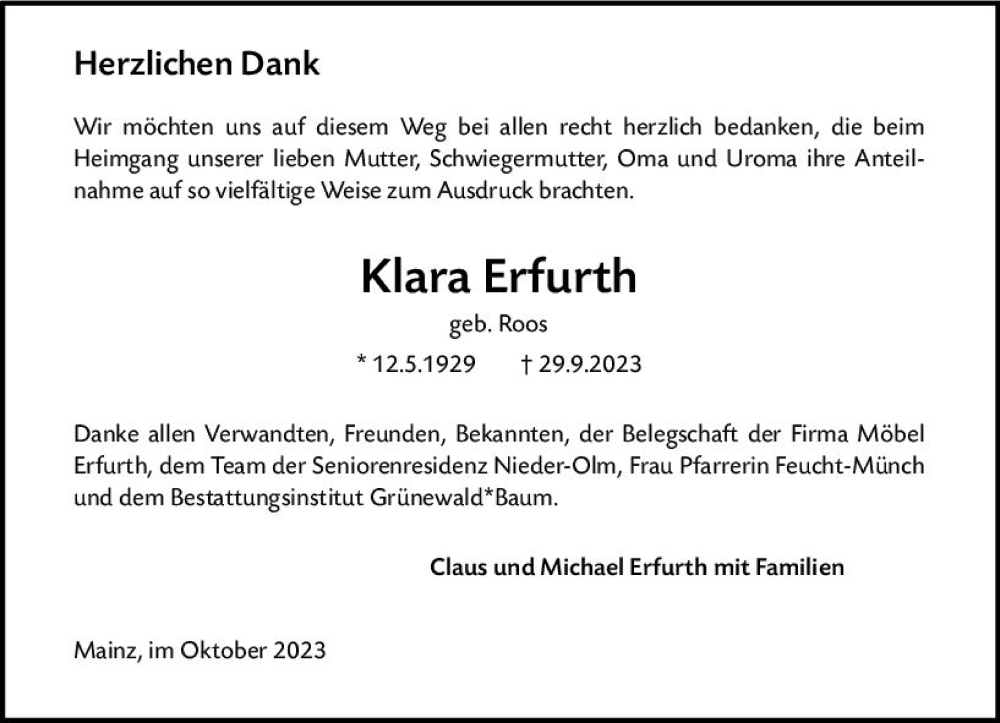 Hier finden Sie alle Traueranzeigen aus der Zeitung, die bisher für Klara Erfurth erschienen sind. Weitere Traueranzeigen, die in der Zeitung erscheinen, werden hier ebenfalls aufgelistet