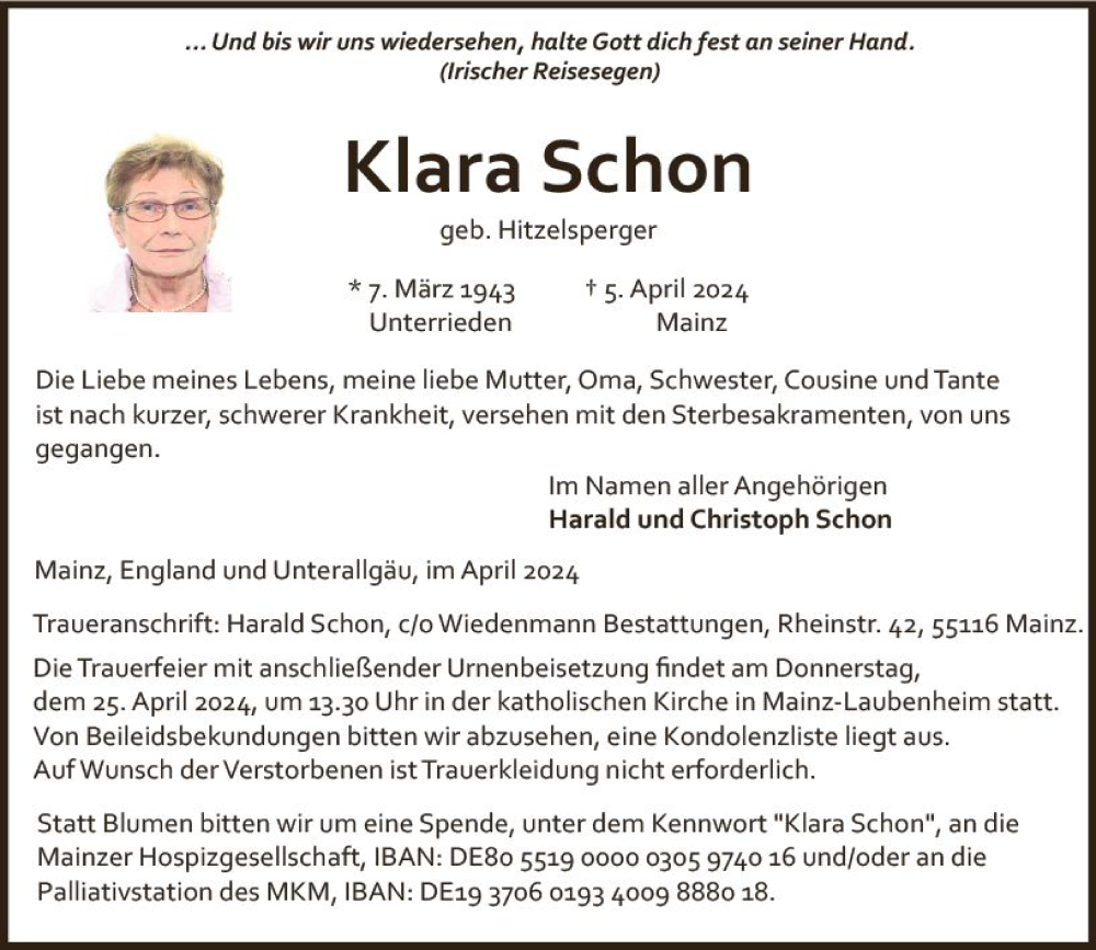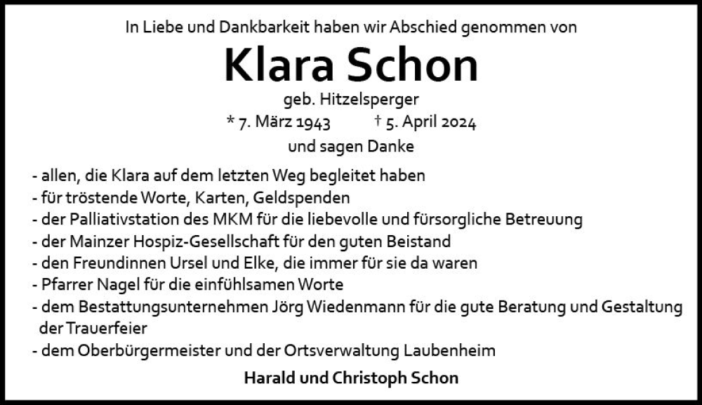 Hier finden Sie alle Traueranzeigen aus der Zeitung, die bisher für Klara Schon erschienen sind. Weitere Traueranzeigen, die in der Zeitung erscheinen, werden hier ebenfalls aufgelistet