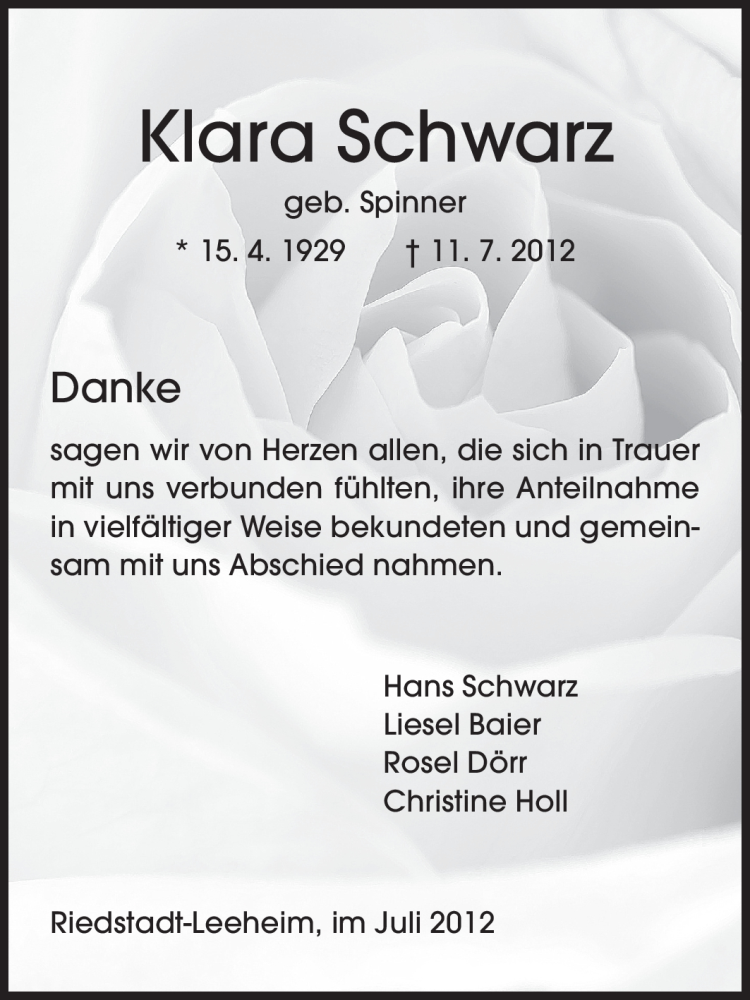 Hier finden Sie alle Traueranzeigen aus der Zeitung, die bisher für Klara Schwarz erschienen sind. Weitere Traueranzeigen, die in der Zeitung erscheinen, werden hier ebenfalls aufgelistet