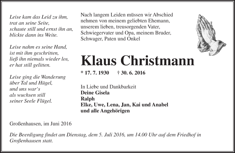 Hier finden Sie alle Traueranzeigen aus der Zeitung, die bisher für Klaus Christmann erschienen sind. Weitere Traueranzeigen, die in der Zeitung erscheinen, werden hier ebenfalls aufgelistet