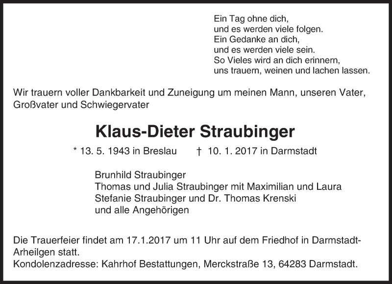 Hier finden Sie alle Traueranzeigen aus der Zeitung, die bisher für Klaus-Dieter Straubinger erschienen sind. Weitere Traueranzeigen, die in der Zeitung erscheinen, werden hier ebenfalls aufgelistet