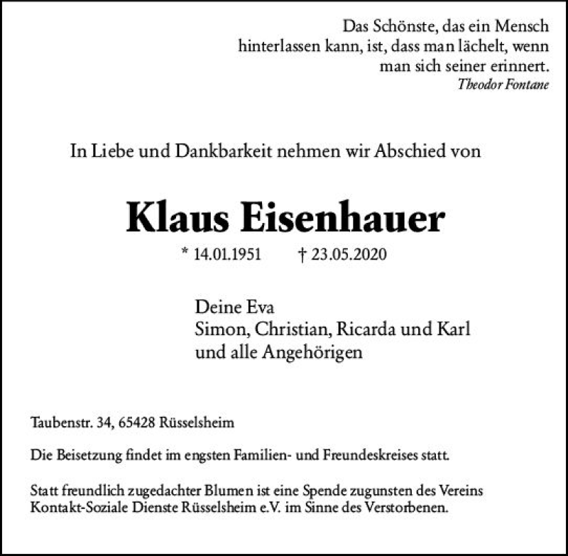 Hier finden Sie alle Traueranzeigen aus der Zeitung, die bisher für Klaus Eisenhauer erschienen sind. Weitere Traueranzeigen, die in der Zeitung erscheinen, werden hier ebenfalls aufgelistet
