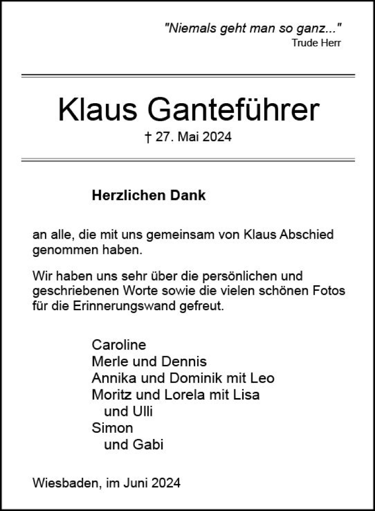 Hier finden Sie alle Traueranzeigen aus der Zeitung, die bisher für Klaus Ganteführer erschienen sind. Weitere Traueranzeigen, die in der Zeitung erscheinen, werden hier ebenfalls aufgelistet