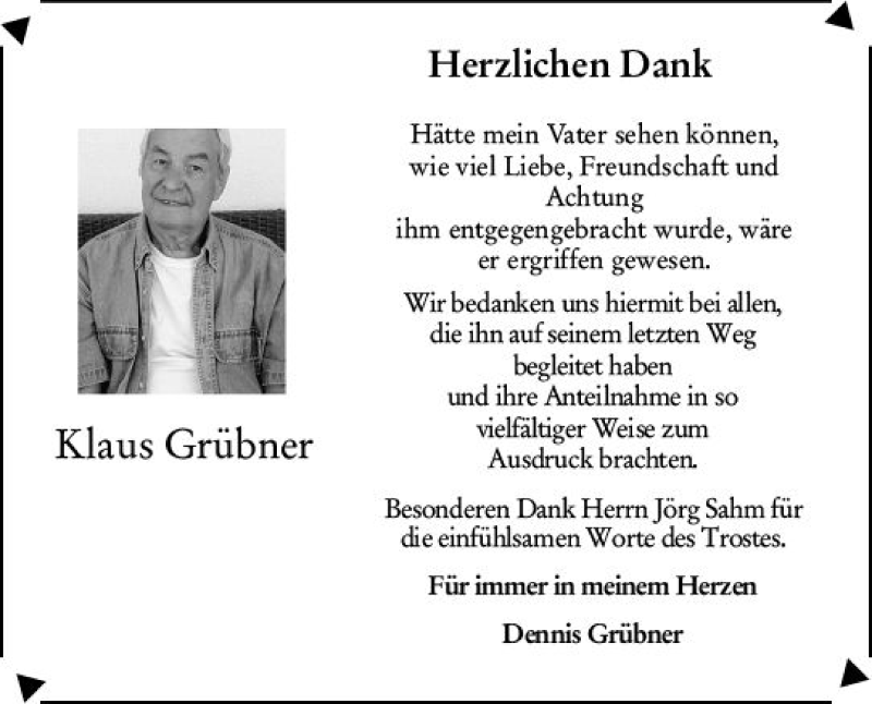 Hier finden Sie alle Traueranzeigen aus der Zeitung, die bisher für Klaus Grübner erschienen sind. Weitere Traueranzeigen, die in der Zeitung erscheinen, werden hier ebenfalls aufgelistet