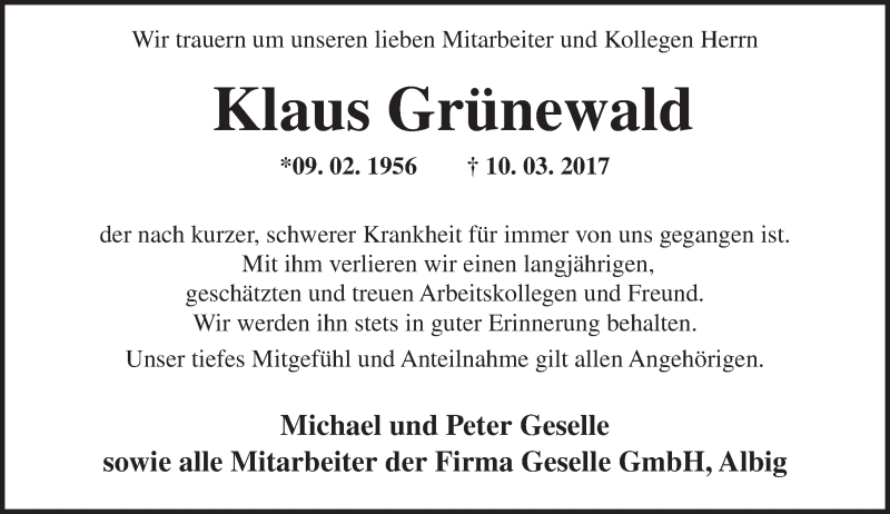 Hier finden Sie alle Traueranzeigen aus der Zeitung, die bisher für Klaus Grünewald erschienen sind. Weitere Traueranzeigen, die in der Zeitung erscheinen, werden hier ebenfalls aufgelistet