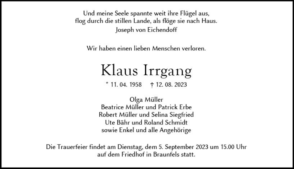 Hier finden Sie alle Traueranzeigen aus der Zeitung, die bisher für Klaus Irrgang erschienen sind. Weitere Traueranzeigen, die in der Zeitung erscheinen, werden hier ebenfalls aufgelistet