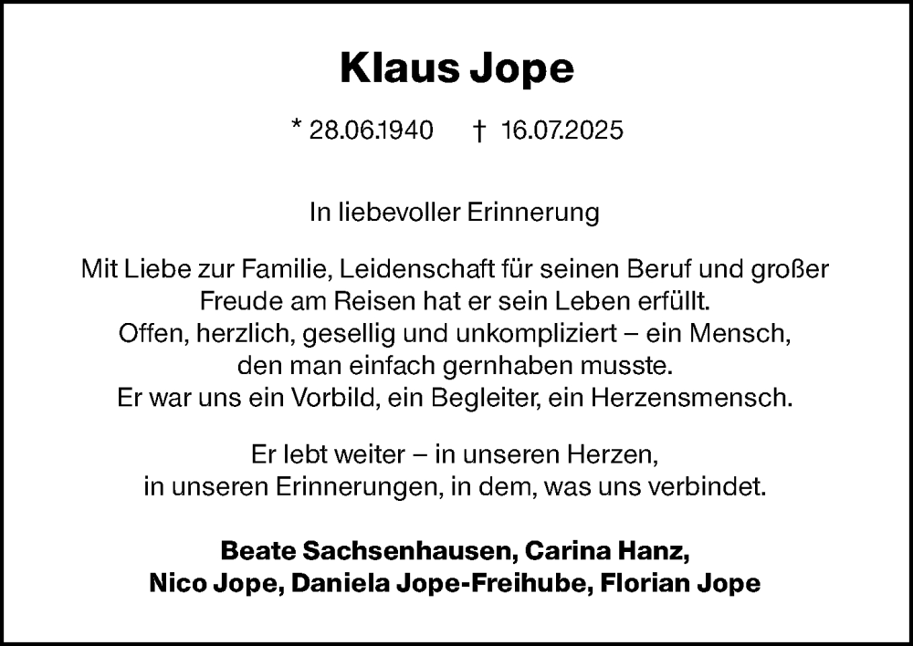Hier finden Sie alle Traueranzeigen aus der Zeitung, die bisher für Klaus Jope erschienen sind. Weitere Traueranzeigen, die in der Zeitung erscheinen, werden hier ebenfalls aufgelistet