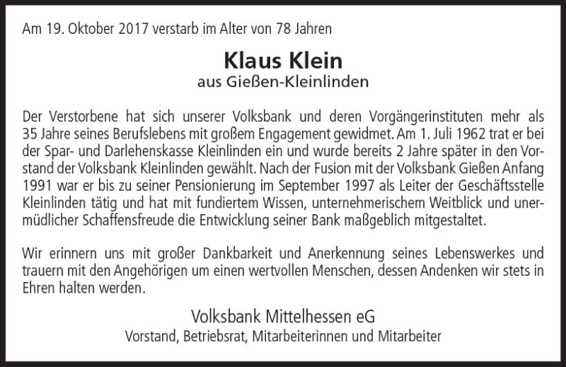Hier finden Sie alle Traueranzeigen aus der Zeitung, die bisher für Klaus Klein erschienen sind. Weitere Traueranzeigen, die in der Zeitung erscheinen, werden hier ebenfalls aufgelistet
