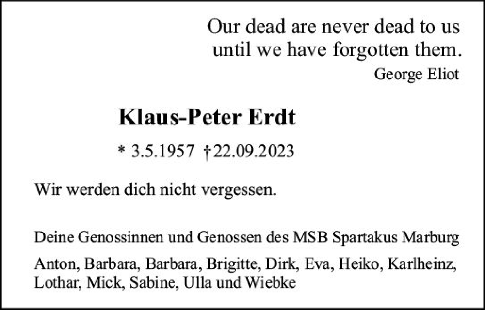 Hier finden Sie alle Traueranzeigen aus der Zeitung, die bisher für Klaus-Peter Erdt erschienen sind. Weitere Traueranzeigen, die in der Zeitung erscheinen, werden hier ebenfalls aufgelistet