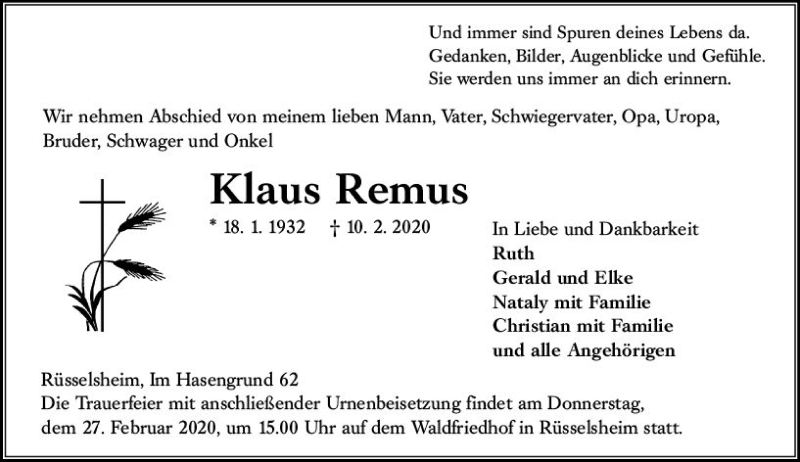 Hier finden Sie alle Traueranzeigen aus der Zeitung, die bisher für Klaus Remus erschienen sind. Weitere Traueranzeigen, die in der Zeitung erscheinen, werden hier ebenfalls aufgelistet