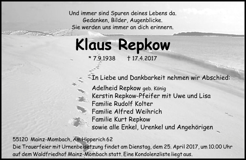 Hier finden Sie alle Traueranzeigen aus der Zeitung, die bisher für Klaus Repkow erschienen sind. Weitere Traueranzeigen, die in der Zeitung erscheinen, werden hier ebenfalls aufgelistet