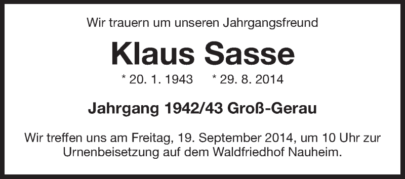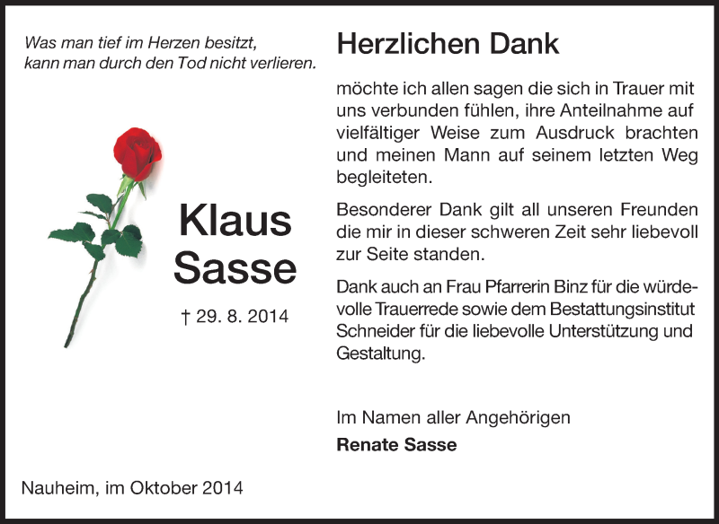 Hier finden Sie alle Traueranzeigen aus der Zeitung, die bisher für Klaus Sasse erschienen sind. Weitere Traueranzeigen, die in der Zeitung erscheinen, werden hier ebenfalls aufgelistet