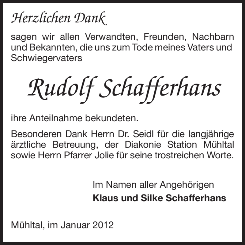 Hier finden Sie alle Traueranzeigen aus der Zeitung, die bisher für Klaus Schafferhans erschienen sind. Weitere Traueranzeigen, die in der Zeitung erscheinen, werden hier ebenfalls aufgelistet