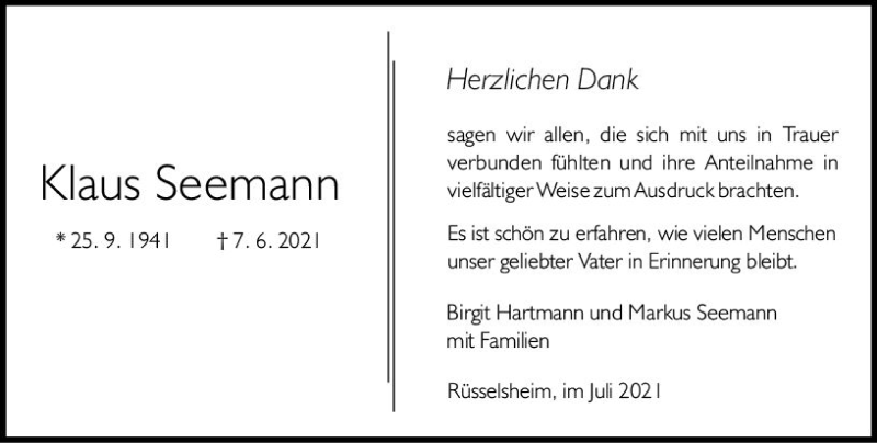 Hier finden Sie alle Traueranzeigen aus der Zeitung, die bisher für Klaus Seemann erschienen sind. Weitere Traueranzeigen, die in der Zeitung erscheinen, werden hier ebenfalls aufgelistet